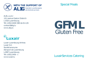 Durante una colaboración con Luxair, el grupo de trabajo asesoró a la compañía sobre el desarrollo de platos sin gluten para ofrecer comidas o refrigerios más sabrosos para los diferentes tipos de vuelos y ALIG les otorgó el derecho a marcar estos preparativos con nuestro acrónimo. Para reservar una comida sin gluten, simplemente llame o envíe un correo electrónico al Luxair Callcenter al menos tres días antes de la salida.